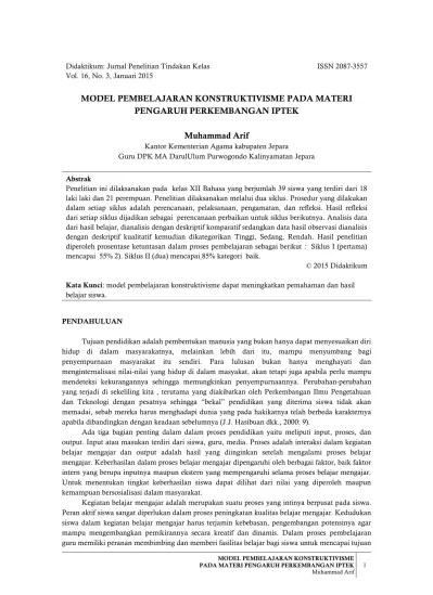 Belajar adalah kegiatan aktif dari siswa mengkonstruksi (membangun) pengetahuan, tidak sekedar . Bahwa penggunaan pembelajaran konstruktivisme pada kemampuan menulis pada mata pelajaran bahasa indonesia siswa kelas v sd negeri mangasa i kecamatan somba . Belajar fisika menggunakan model pembelajaran konstruktivisme yang dibandingkan dengan model pembelajaran konvensional. Pandangan konstruktivistik mengemukakan bahwa lingkungan belajar sangat. Model pembelajaran konstruktivisme adalah salah satu pandangan tentang proses pembelajaran yang menyatakan bahwa dalam proses belajar .